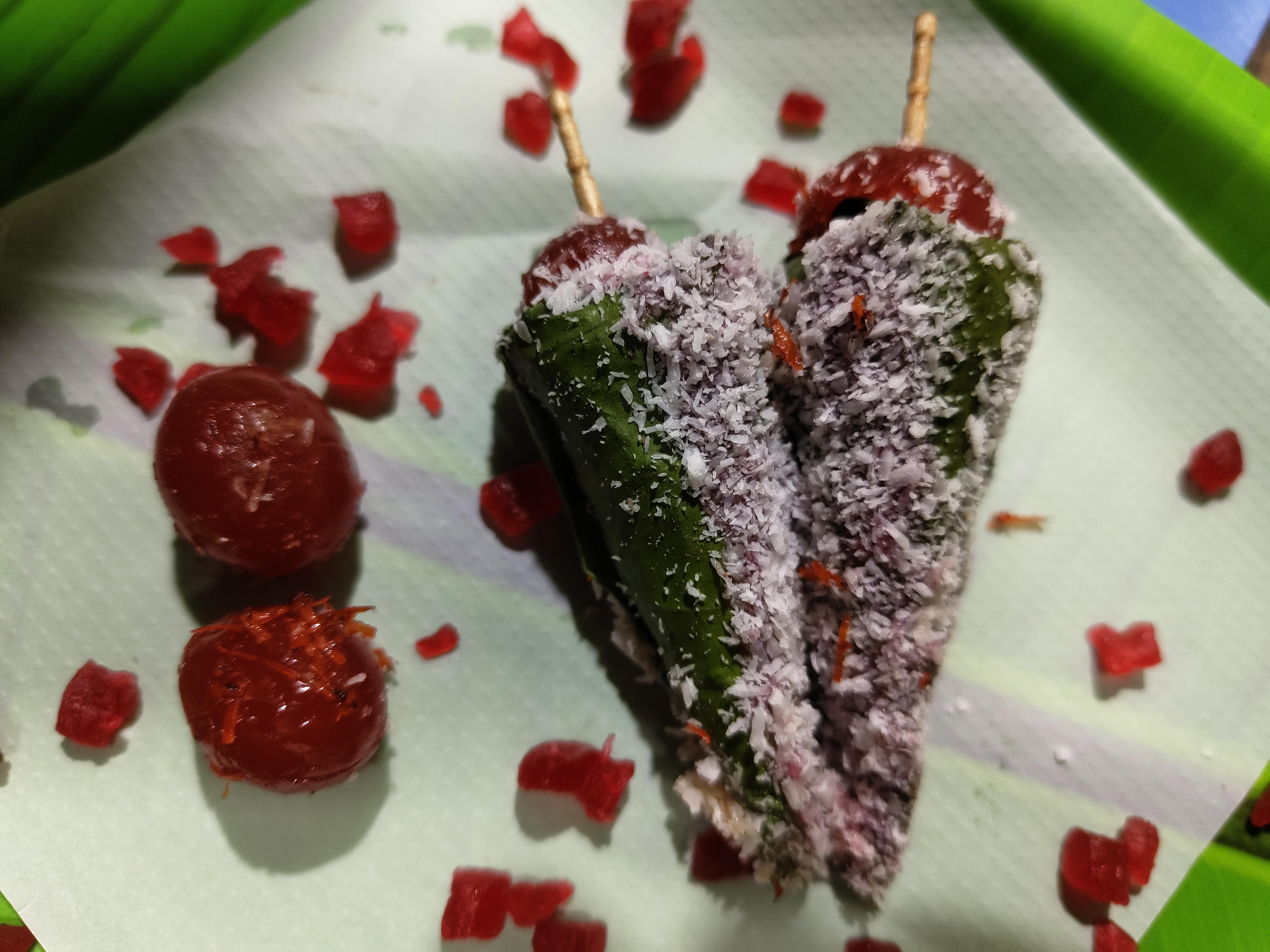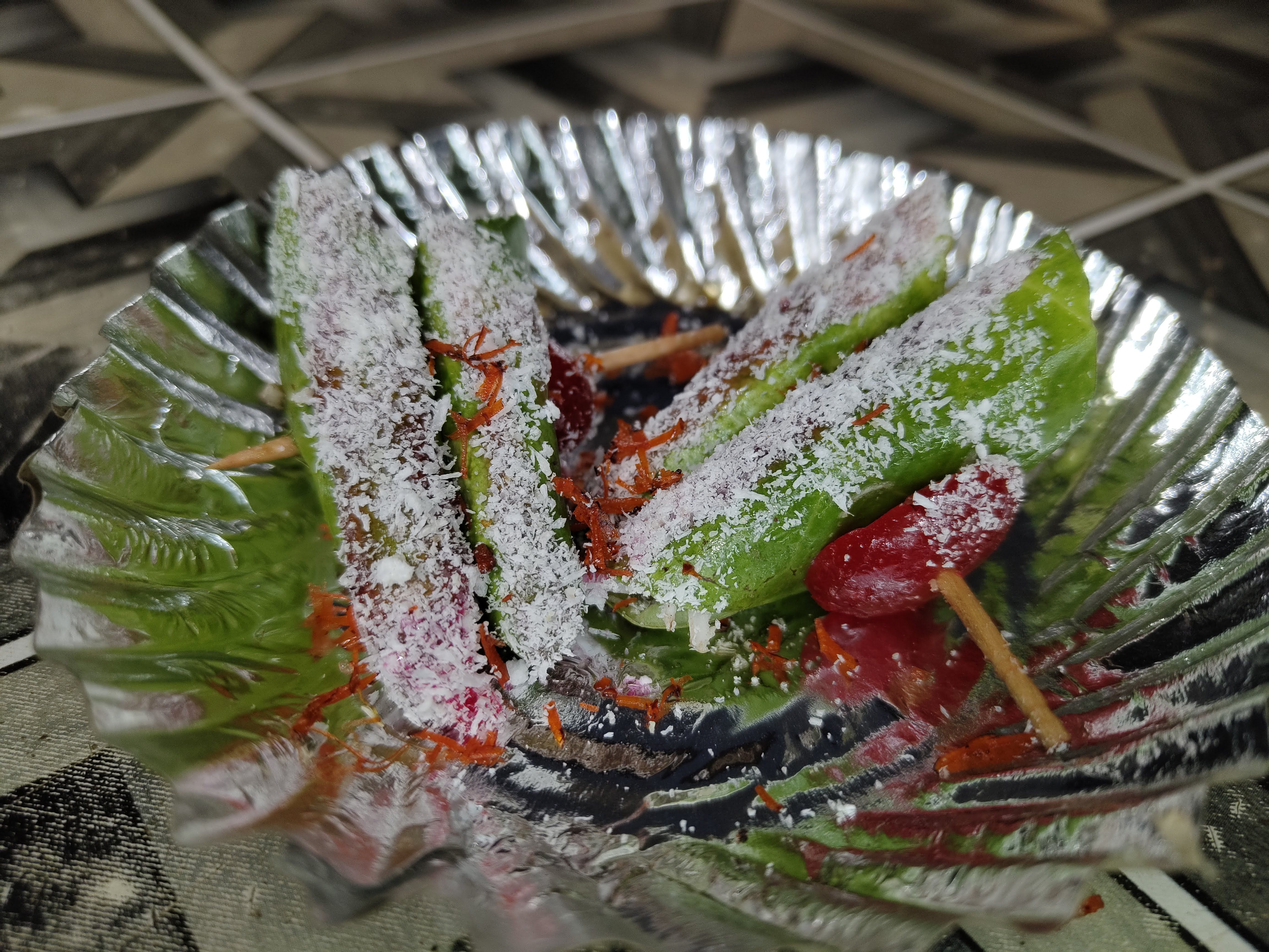 A sweetened version of the classic Kolkata paan for meetha paan lovers. Kolkata mithha paan, sweet paan, flavored paan. Fresh Betel Leaf (Paan Leaf) and Paan Essence.